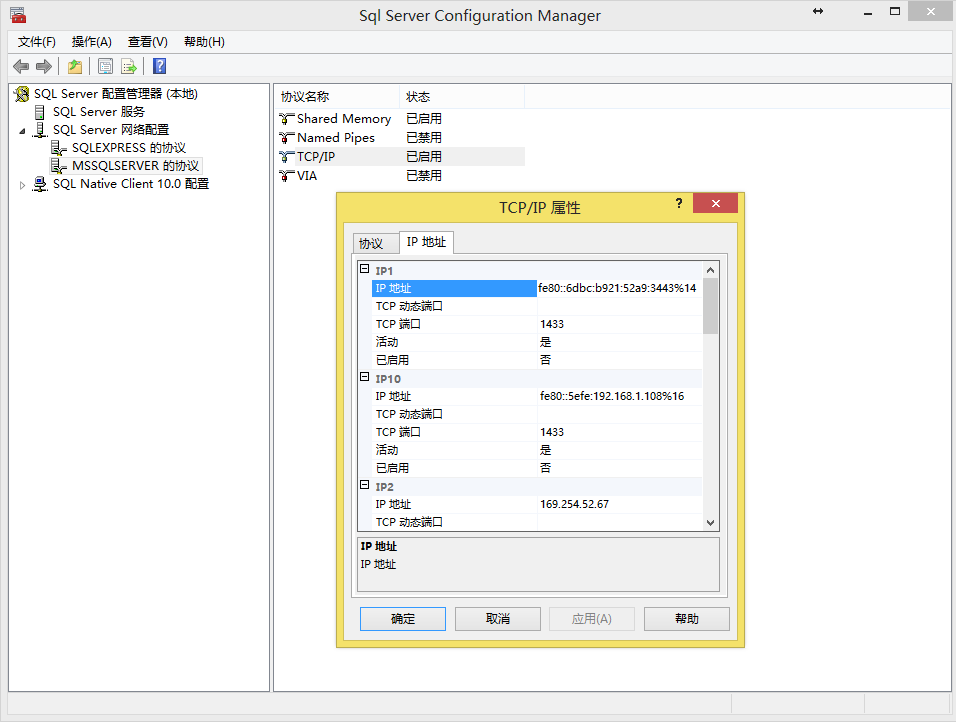 (二)为微软SQL服务器(MSSQLServer)配置相应协议。