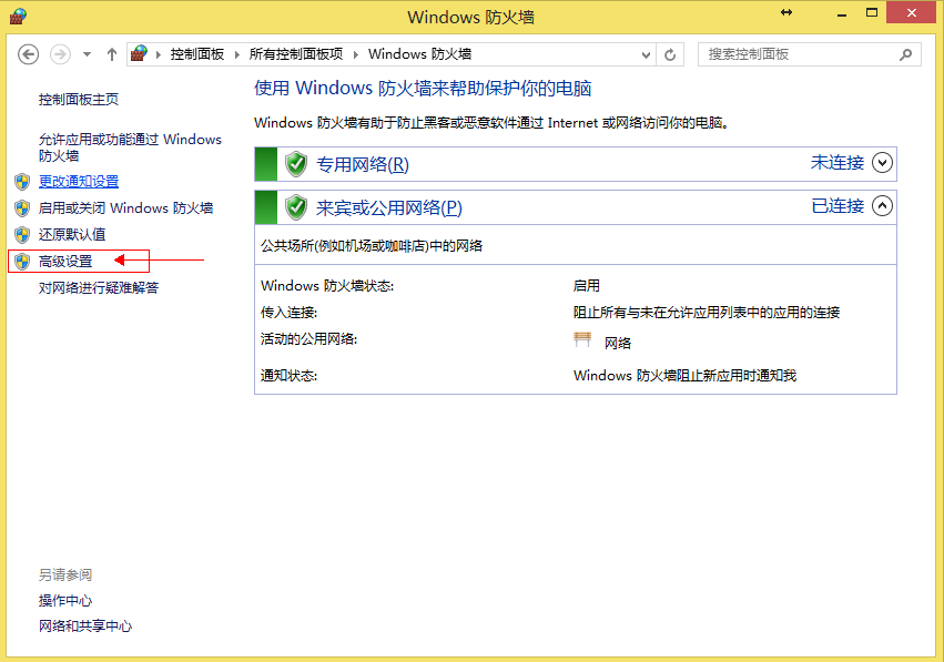 从上图中我们可以看出,这台SQL服务器上支持TCP/IP协议的是1433端口。下一步要做的是在防火墙的配置中允许1433端口支持TCP/IP协议即可。如果服务器上运行的是Windows 7操作系统,其配置步骤为(其他微软操作系统的做法类似),打开“控制面板”选择“Windows防火墙”选项,然后点击高级选项,如下图所示: