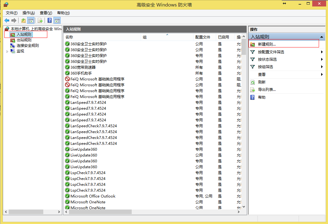 (2)选择“高级设置”后,在右边菜单栏中找出“具有高级安全选项的Windows防火墙”并将其打开。打开后会发现在左边菜单栏中有“入站规则(Inboud Rules)”选项。将该选项打开,并在右边菜单栏中选择“新建规则(New Rule)”选项: