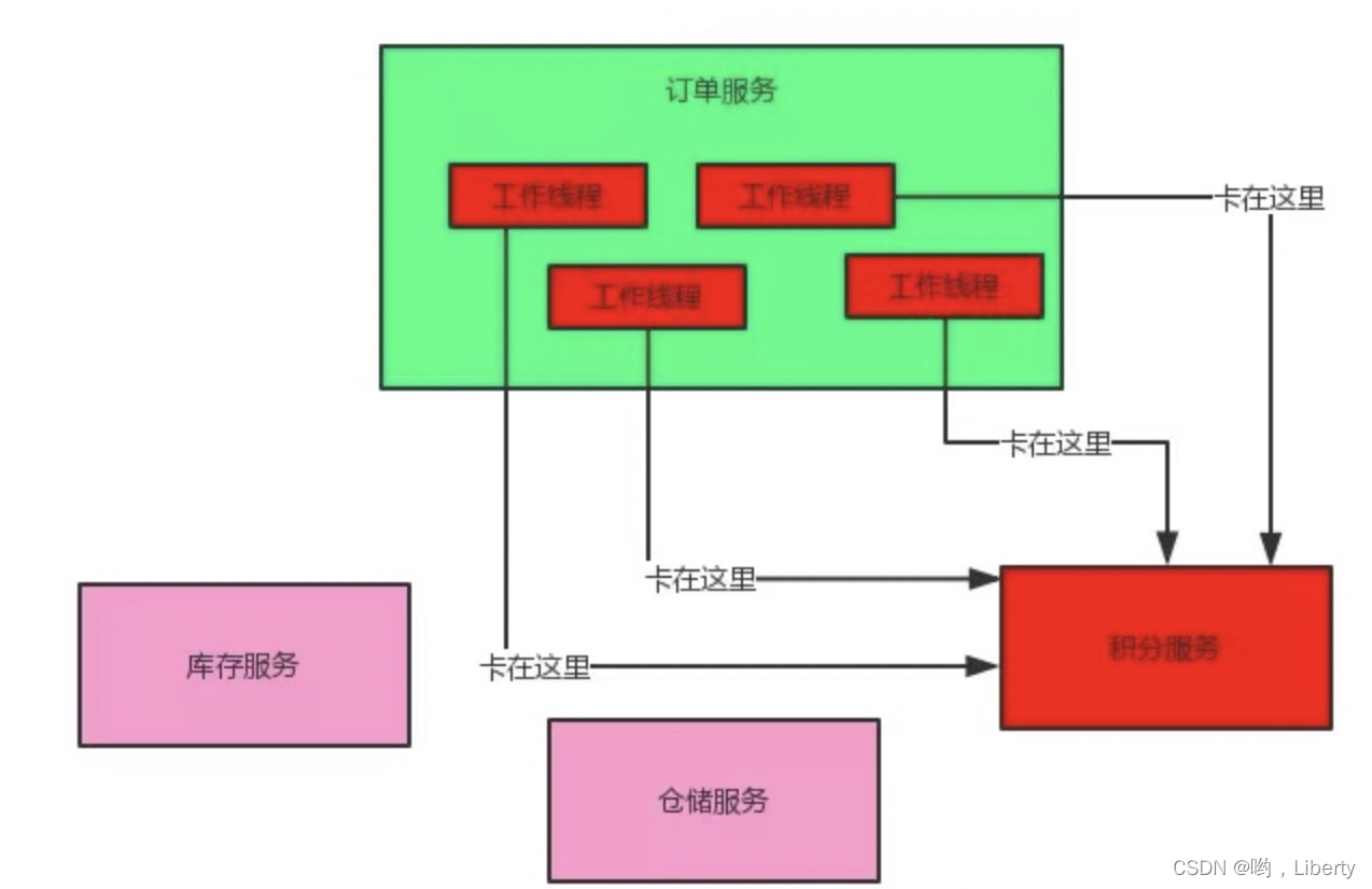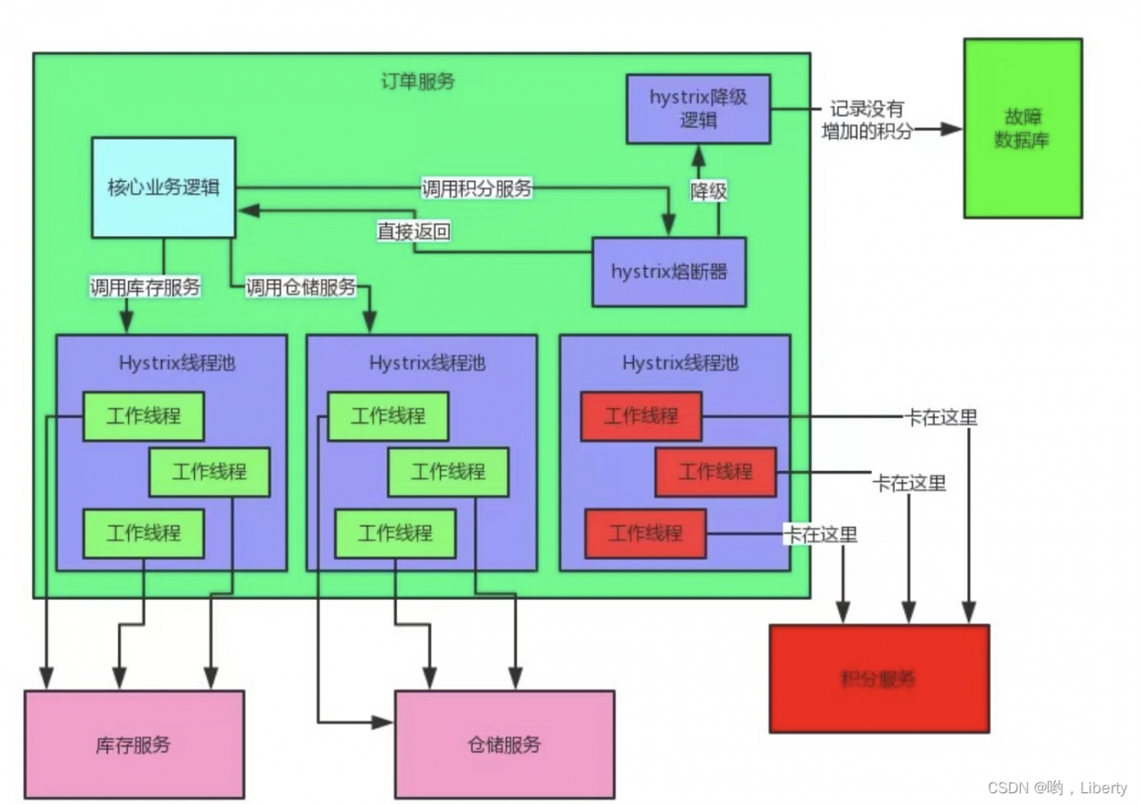 订单服务调用积分服务,由于积分服务异常导致订单服务的请求都在调用积分服务时卡住几秒钟,高并发情况下,订单服务所有的线程都卡在请求积分服务侧,将导致订单服务异常。这就是服务雪崩。熔断器的存在就是需要在积分服务异常情况下,订单服务仍正常运行不会出现服务异常情况。