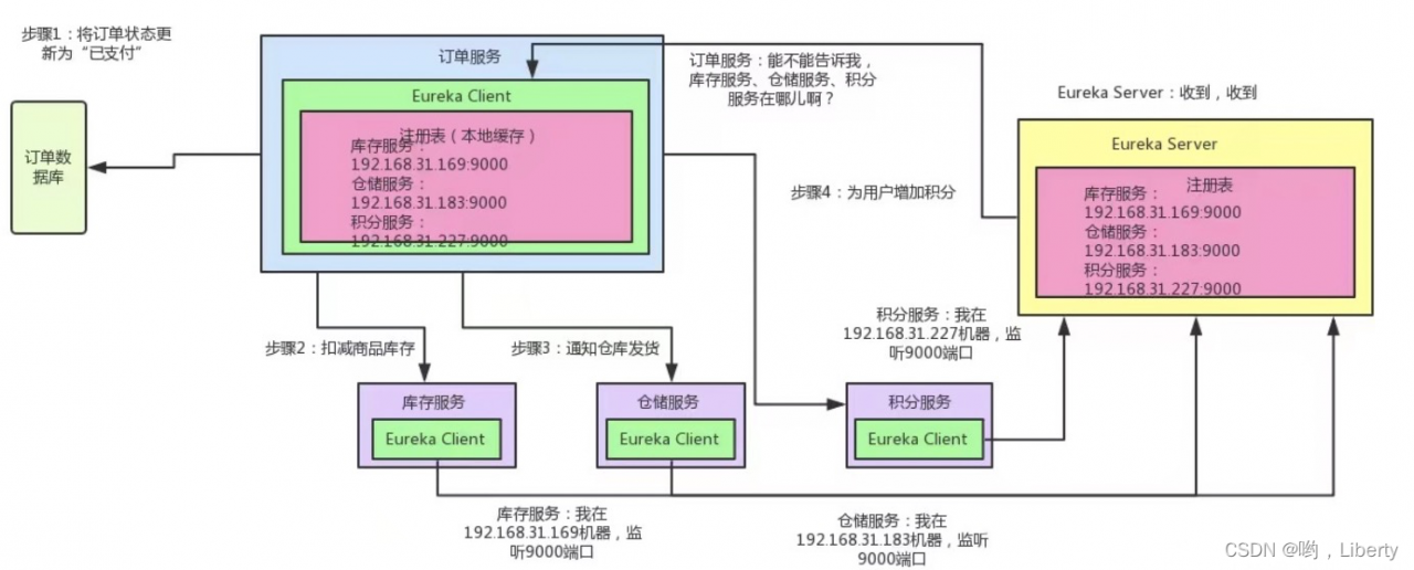 每一个服务(订单服务、库存服务、积分服务...)中都会有一个Eureka Client组件,此组件就是负责将服务的信息注册到Eureka Server中(实质上是将服务的地址和端口暴露到Eureka Server注册中心上);