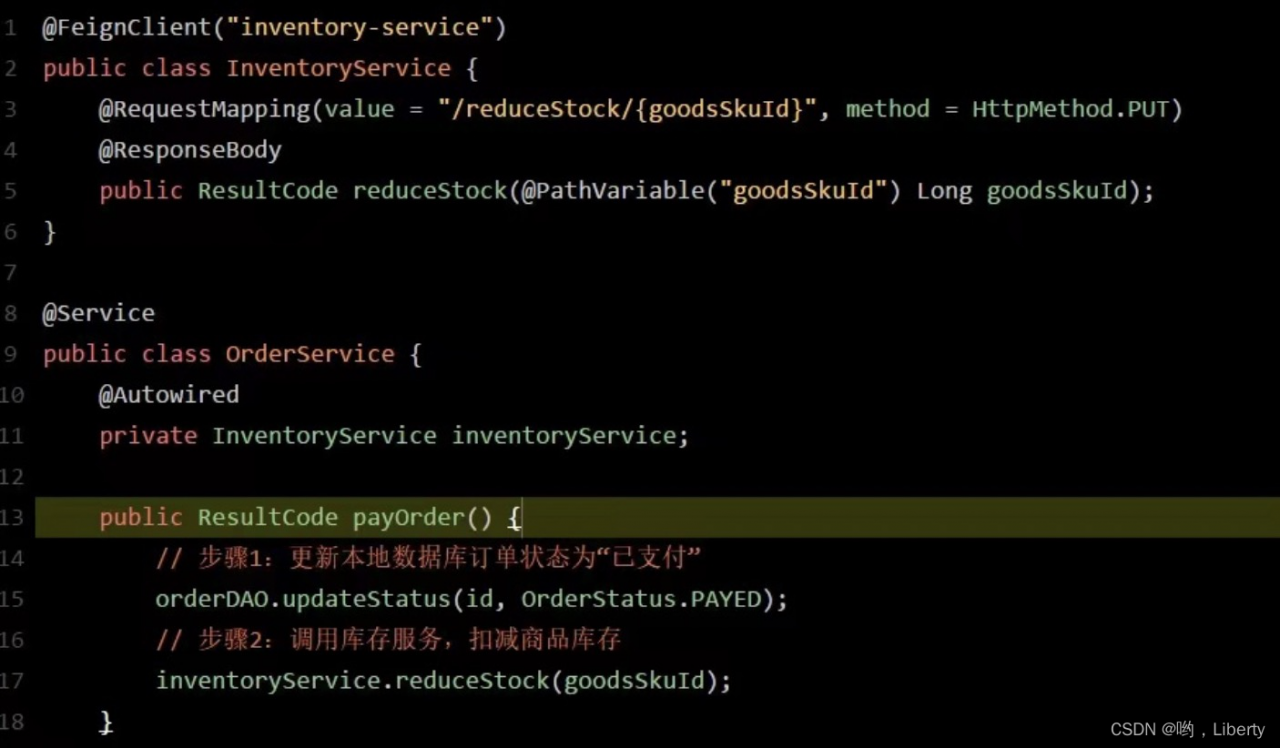 Feign:服务调用。服务与服务之间的代码调用方式基于含有注解FeignClient自定义的接口。简化了构建服务之间网络连接等环节。FeignClient会根据接口配置到注册中心(本地缓存)找到对应的请求服务接口。