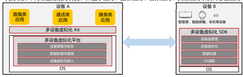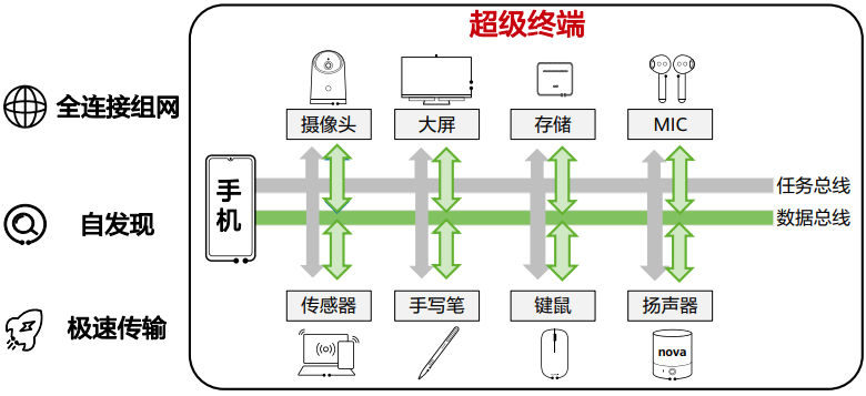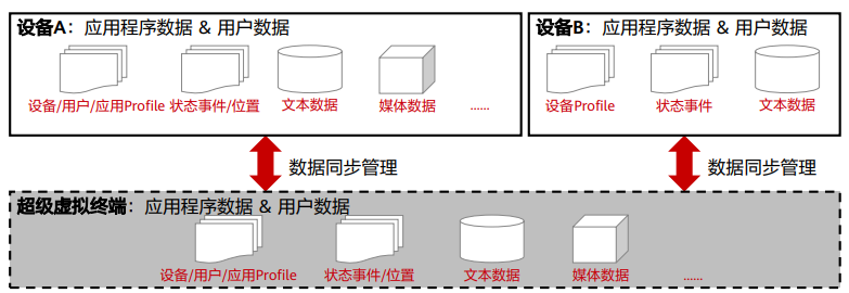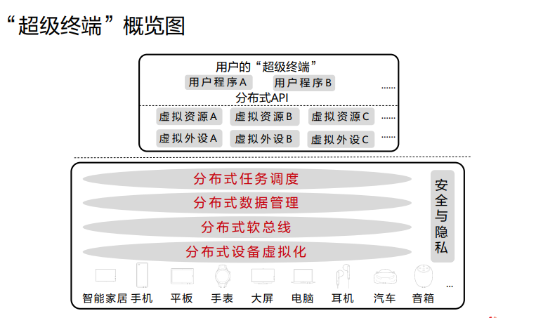 - 分布式设备虚拟化平台可以实现不同设备的资源融合、设备管理、数据处理,多种设备共同形成一个超级虚拟终端。