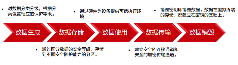 在分布式终端场景下,需要确保用户能够正确地使用数据。HarmonyOS围绕数据的生成、 存储、使用、传输以及销毁过程进行全生命周期的保护,从而保证个人数据与隐私、以 及系统的机密数据(如密钥)不泄漏。