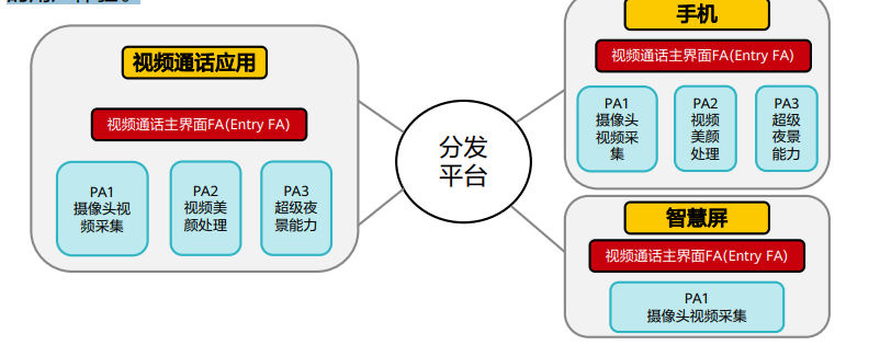 - 基于FA/PA开发的应用,能够实现特定的业务功能,支持跨设备调度与分发,为用户提供一 致、高效的应用体验
