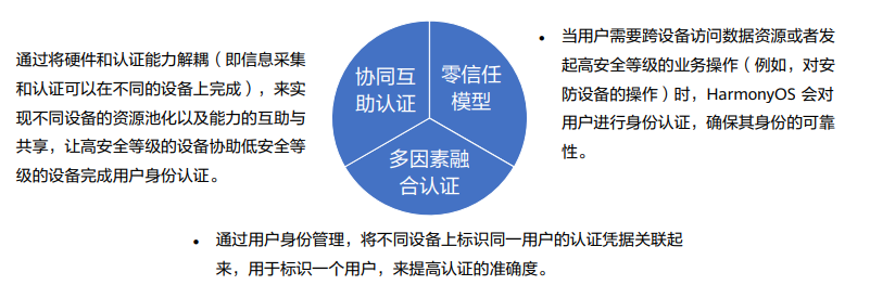 在分布式终端场景下, “正确的人”指通过身份认证的数据访问者和业务操作者。 “正 确的人”是确保用户数据不被非法访问、用户隐私不泄露的前提条件。HarmonyOS通过 以下三个方面来实现协同身份认证:零信任模型 多因素融合认证 协同互助认证