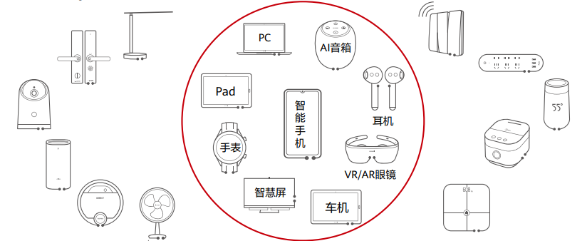 在传统的单设备系统能力的基础上,HarmonyOS提出了基于同一套系统能力、适配多种终端形态的分布式理念,能够支持手机、平板、智能穿戴、智慧屏、车机等多种终端设备。