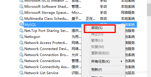 1.手动 打开cmd ------>输入services.msc打开服务器的窗口----->找到MySQL服务右键启动
