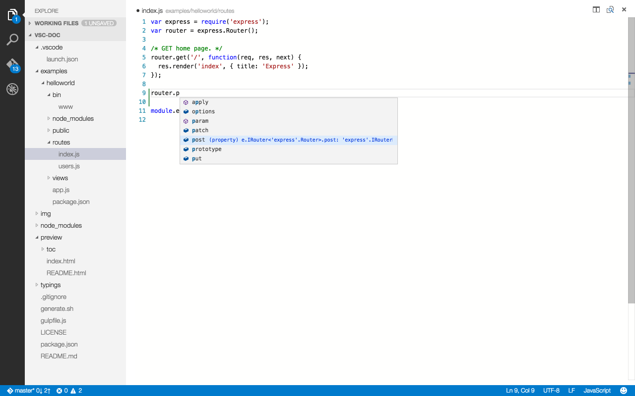 typings/express/express.d.ts 在代码编辑区里,输入CTRL+SPACE(默认快捷键)就可以有提示了。