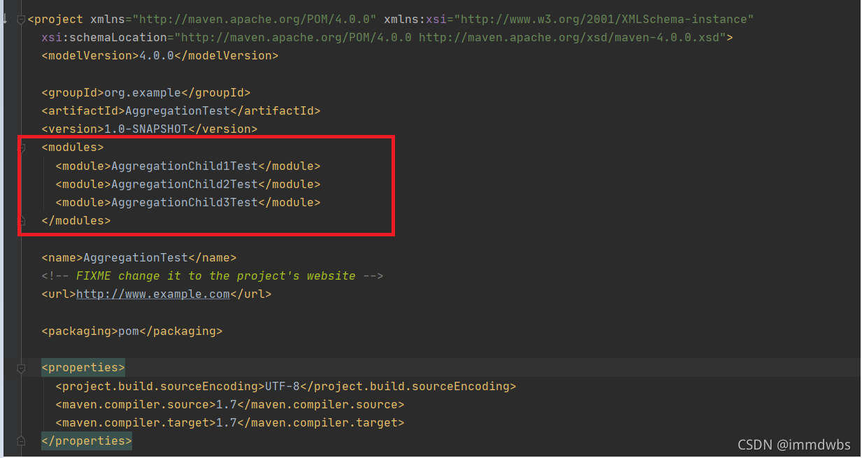 通过在一个项目中,将<packaging>设置为pom,同时在项目下new module创建其子项目,就生成了一个聚合关系的项目。