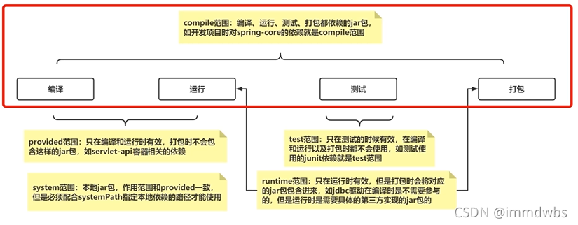 - runtime: 在执行时需要使用 - test: 用于test任务时使用 - system: 需要外在提供相应的元素。通过systemPath来取得
