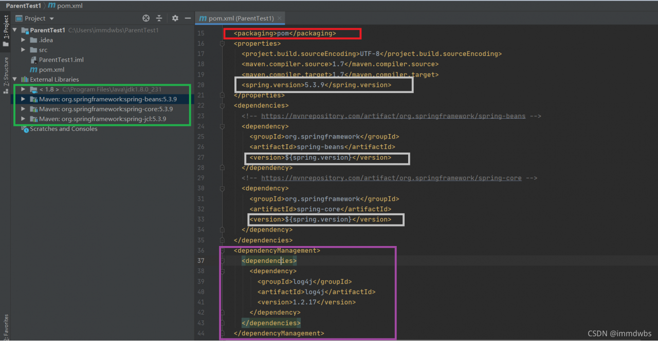 c、普通的dependcies中的依赖会被加载到父项目中,而dependencyManagement中的则不会被加载,而只是定义了版本