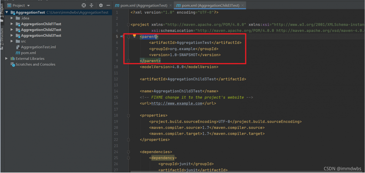 (1)聚合关系中的父项目会,自动更新pom文件,将子项目记录在<modules>中