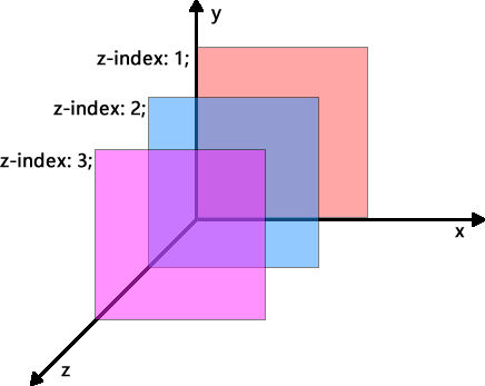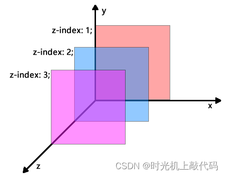 通常我们可能会认为 HTML 网页是个二维的平面,因为页面中的文本、图像或者其它元素都是按照一定顺序排列在页面上的,每个元素之间都有一定的间隙,不会重叠。然而,实际的网页其实是三维的,元素之间可能会发生堆叠(重叠),您可以通过 CSS 中的 z-index 属性来设置元素的堆叠顺序,如下图所示: