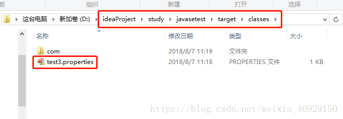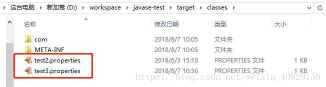 可以看出,位于src/main/java/下的test2.properties以及test1.properties都不存在于classes目录下,也就是说存放于src/main/java/目录下配置文件在编译器不会被加载到classes中,即不能在运行时去加载该路径下的配置文件,而应当把配置文件放入到/src/main/resources下,因为很明显test3.properties已被加载到classes目录中。