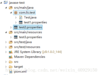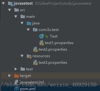 项目结构:将三个properties配置文件test1,test2,test3分别放于/src/main/java/com/lic/test,/src/mian/java,/src/main/resources这三个目录下。