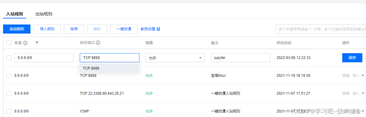 本文介绍在云服务器上搭建,所以首先要准备一台云服务器,阿里云、腾讯云、华为云都可以。准备好之后在云服务器安全组里将端口8888打开。Jupyter Notebook默认会用到8888端口,也可以修改为其他端口。