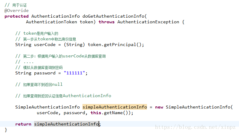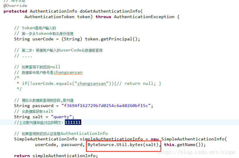 如果查询到用户信息,就给ModularRealmAuthenticator返回用户信息(账号和密码)