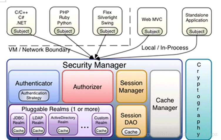 cache Manager:缓存管理器,主要对session和授权数据进行缓存,比如将授权数据通过cacheManager进行缓存管理,和ehcache整合对缓存数据进行管理。