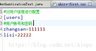 5、IniRealm根据输入的token(UsernamePasswordToken)从 shiro-first.ini查询用户信息,根据账号查询用户信息(账号和密码)