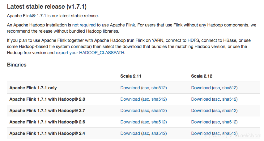 Flink安装包下载地址:http://flink.apache.org/downloads.html ,选择对应Hadoop的Flink版本下载