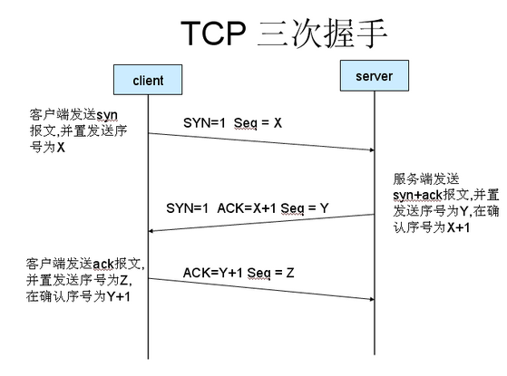 客户端发送一个TCP的SYN标志位置1的包指明客户打算连接的服务器的端口,以及初始序号X,保存在包头的序列号(Sequence Number)字段里。
