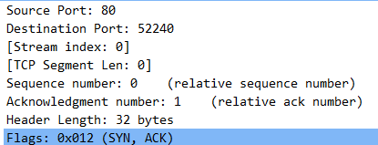 SYN、ACK置位,确认序列号为客户端ISN+1 。服务器发送序列号为0。
