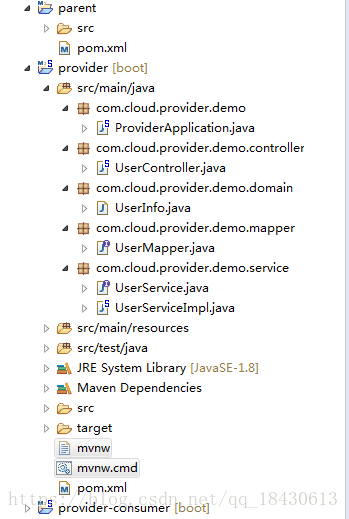1.先看看整体项目的一个架构,parent 项目父依赖包,用于管理我们的依赖,provider 服务提供方,consumer 消费者。