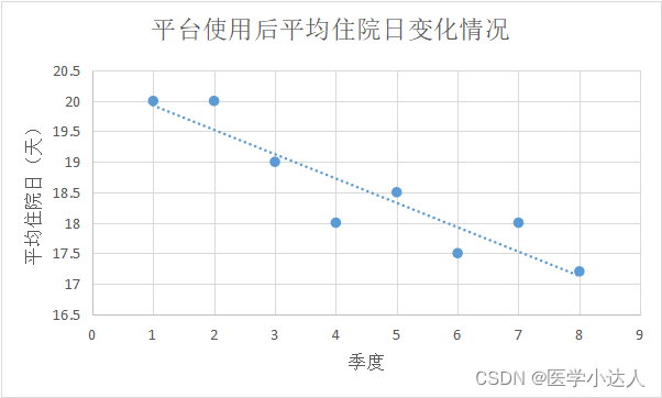 描述:在某平台上线后,得出某指标(某疾病平均住院日)随着应用时间的推移发生的变化情况,在指标平台实施后选取8个季度进行统计分析,如下表: