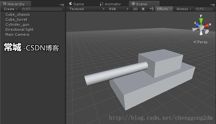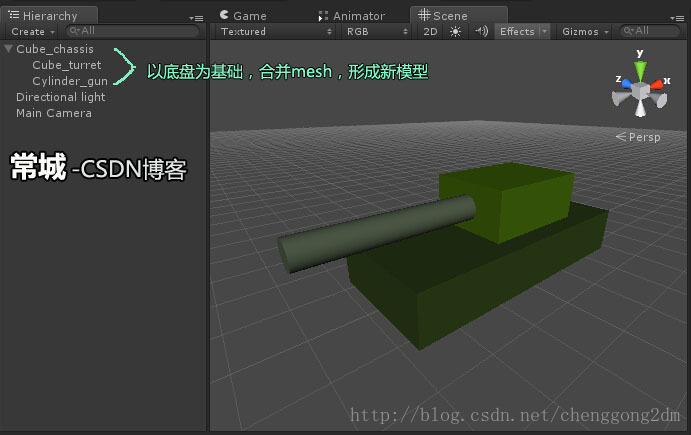 3,把炮塔(Cube_turret)和炮管(Cylinder_gun),变成底盘(Cube_chassis)的子物体。也就是说,新的模型,是以底盘为基础的。
