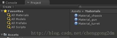 2,为了测试换装,我们加入三个材质球,调整一下颜色,然后分别赋给底盘(Cube_chassis)、炮塔(Cube_turret)、炮管(Cylinder_gun)。