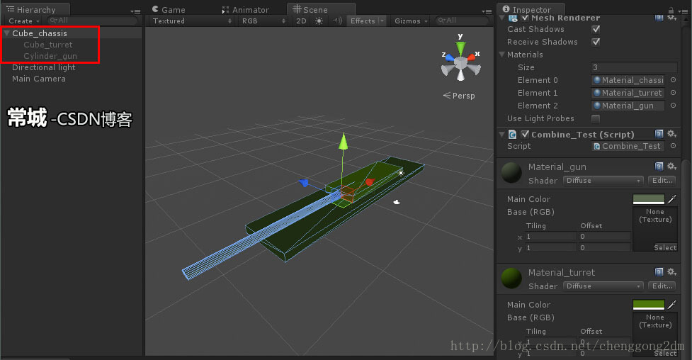 4,用CombineMeshes方法,合并mesh。并且用代码把【材质】也一起“合并”了。把下面的Combine_Test.cs文件,拖拽到底盘(Cube_chassis)上,之后运行。