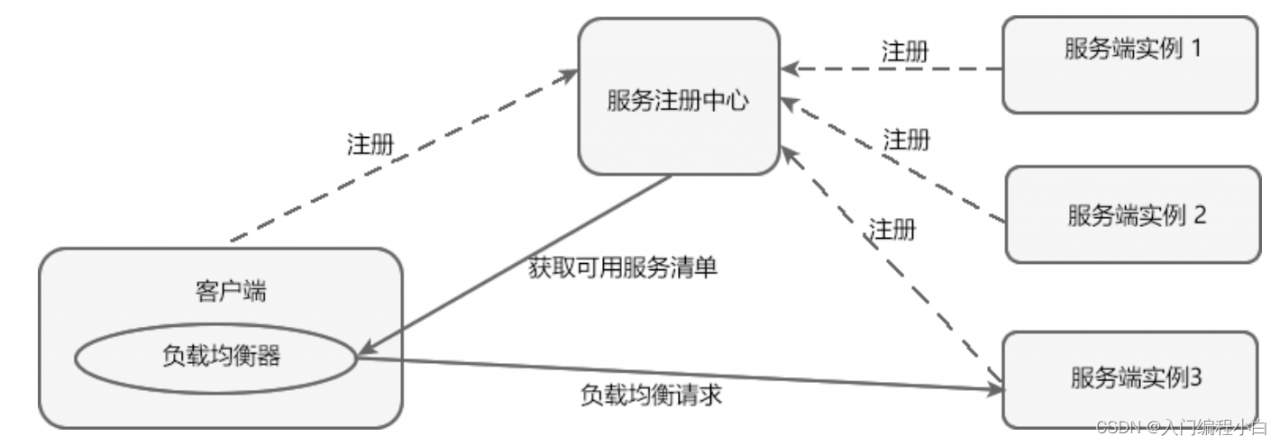 客户端负载均衡是将负载均衡逻辑以代码的形式封装到客户端上,即负载均衡器位于客户端。客户端通过服务注册中心(例如 Eureka Server)获取到一份服务端提供的可用服务清单。有了服务清单后,负载均衡器会在客户端发送请求前通过负载均衡算法选择一个服务端实例再进行访问,以达到负载均衡的目的;