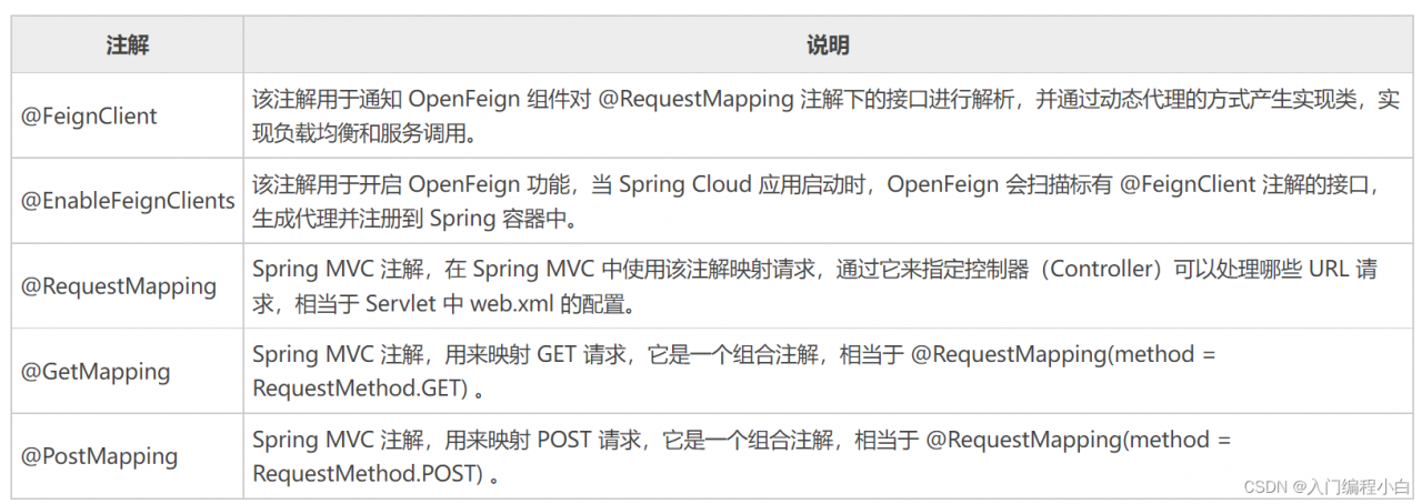 使用 OpenFegin 进行远程服务调用时,常用注解如下表。