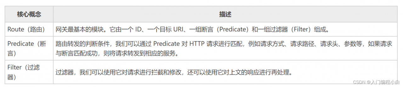 Spring Cloud GateWay 最主要的功能就是路由转发,而在定义转发规则时主要涉及了以下三个核心概念,如下表。
