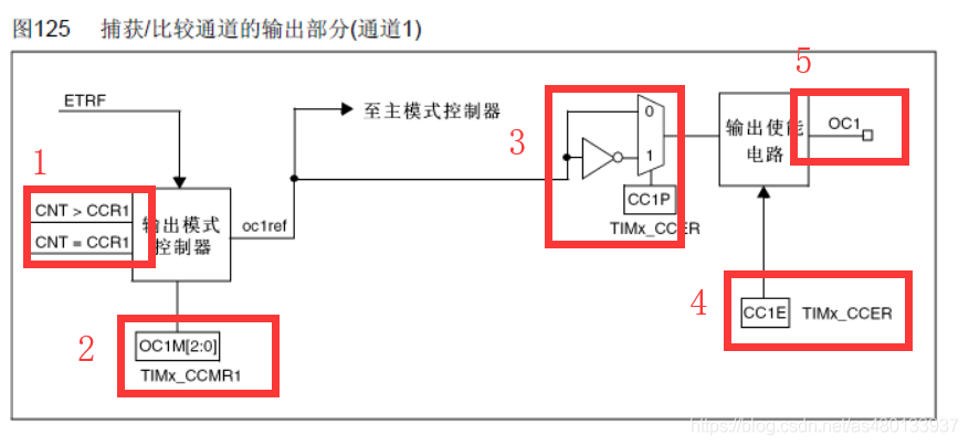 - 当CNT等于或大于CCRx时,TIMx_CHx通道输出高电平。