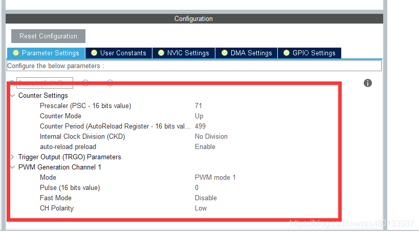在 Parameter Settings 页配置预分频系数为 71,计数周期(自动加载值)为 499,定时器溢出频率,即PWM的周期,就是 72MHz/(71+1)/(499+1) = 2kHz