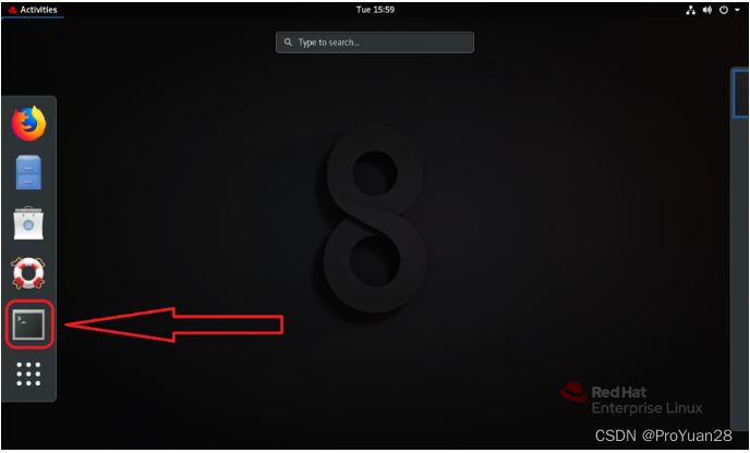 登录成功后,单击桌面左上角的Activities按钮,在左侧弹出的菜单中单击命令行终端图标即可打开Bash解释器,如图2-3所示。