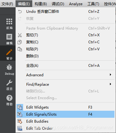 2、选择菜单“编辑”,找到Edit Signals/Slots,或者在工具栏中找到第二项(第二张图),然后拖动按钮并释放,