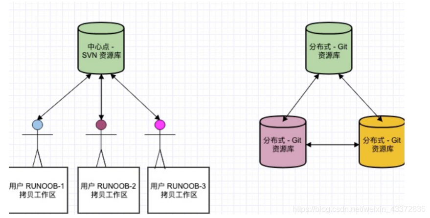 - 这是 Git 和其它非分布式的版本控制系统,例如 SVN,CVS 等,最核心的区别。