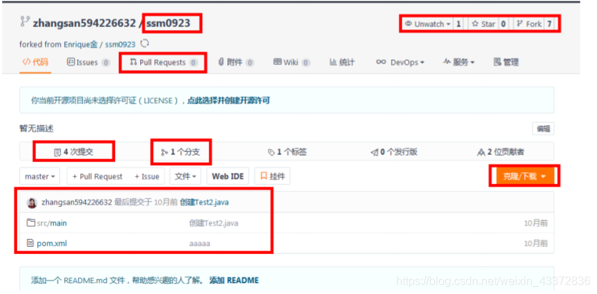 仓库主页主要显示项目的信息,如:代码,版本,收藏,关注,fork等