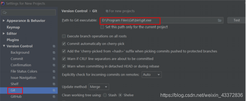 File — Settings---Version Control — Git关联Git安装目录下的