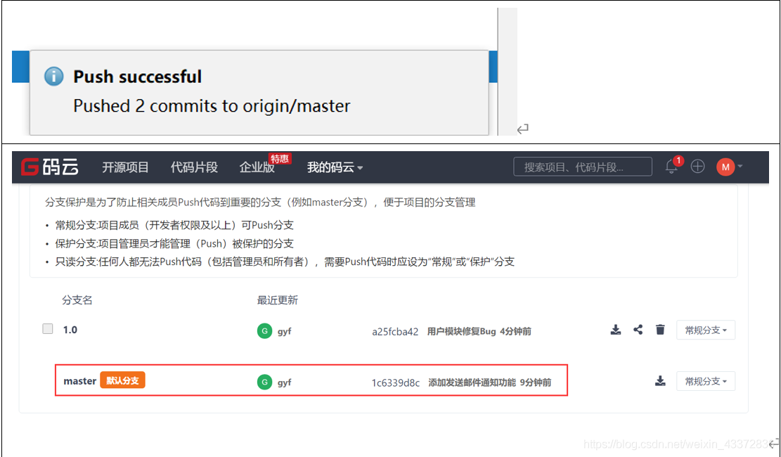 在推的过程中,会弹出输入git服务器的用户名和密码,输入即可 推送成功后,在码云服务器会看到更新的功能 |