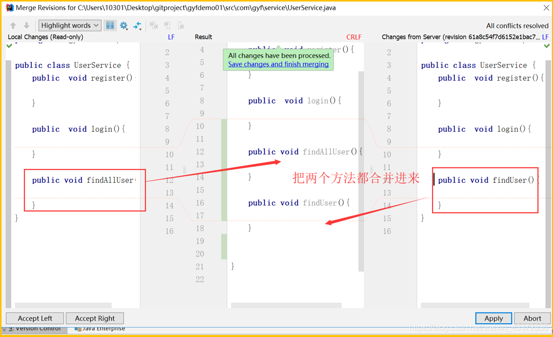 合并后,然后再次push即可以了 注意:A开发者更新后,另一个开发者可以重新pull更新代码到本地 |