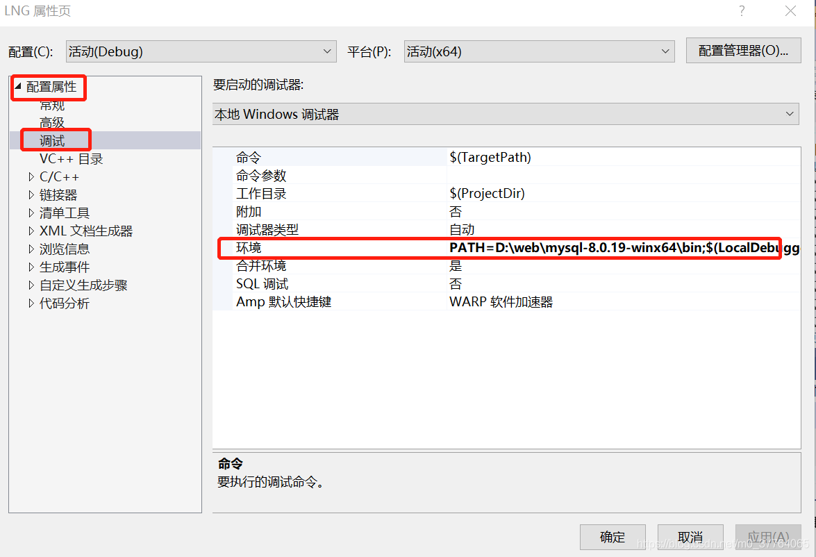 在项目属性页的“配置属性”-“调试”-“环境” 中编辑,把环境设置为数据库的bin文件夹即可,注意末尾分号要用半角的。