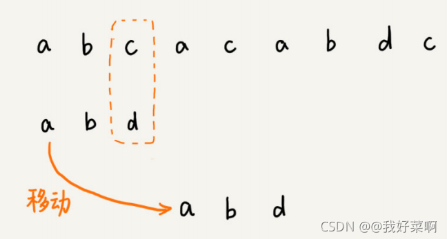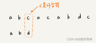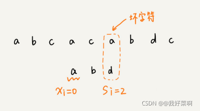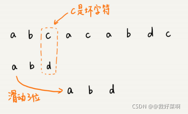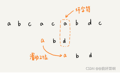 我们将模式串滑动到c之后,就会发现,模式串中的最后一个字符d,还是无法与主串中的字符a相互匹配。此时,我们是否能将模式串滑动到主串中坏字符a(主串中第三个a)的后面?