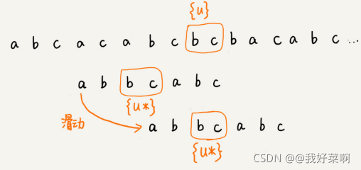 我们把已经匹配的"bc"称为好后缀,记作{u}.我们用他在模式串中进行查找,如果找到另一个与好后缀{u}匹配的子串{u*},那么我们就将模式串滑动到子串{u*}与好后缀{u}上下对齐的位置。如下图。