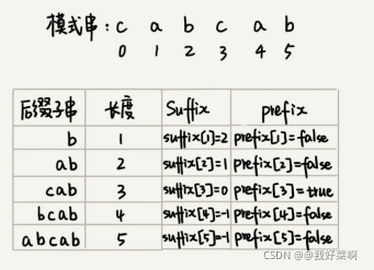 if(j == -1) prefix[k] = true; //公共后缀子串也是模式串的前缀子串