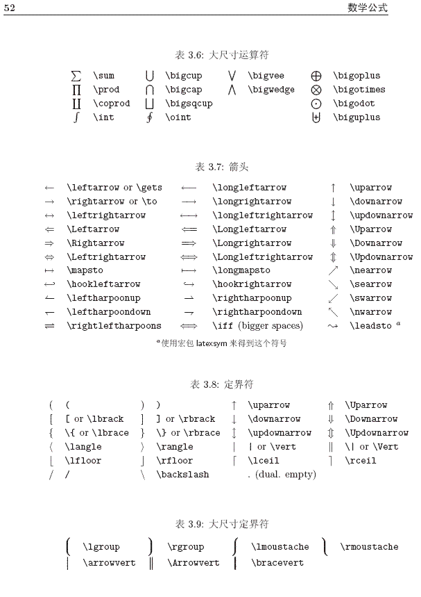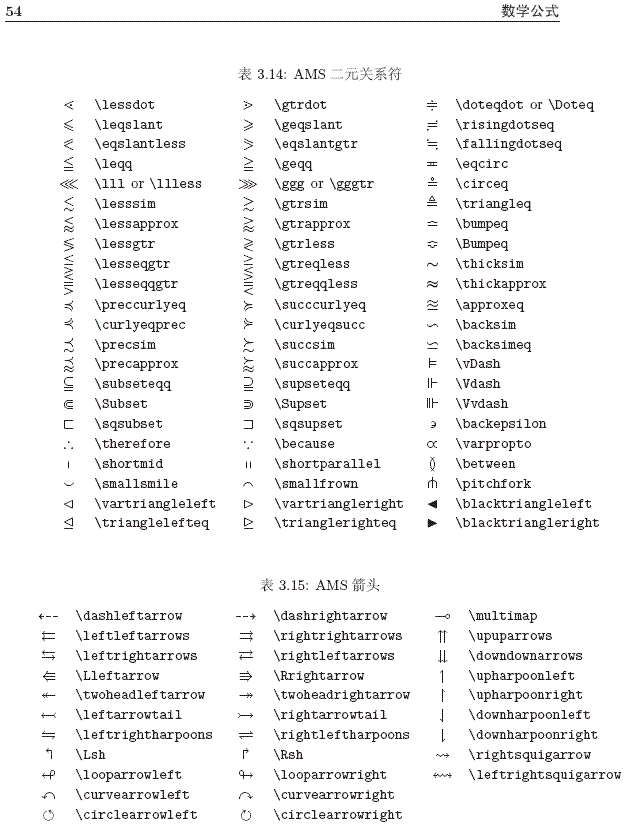 5、向量(Vectors)通常用上方有小箭头(arrow symbols)的变量表示。这可由\vec 得到。另两个命令\overrightarrow 和\overleftarrow在定义从A 到B 的向量时非常有用。