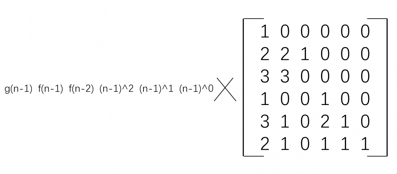 再通过简单的递推一下,左边n代3,可以得到一个常数矩阵,再乘以右边矩阵的n-2次方,得到矩阵的第一行第一列元素即为答案。